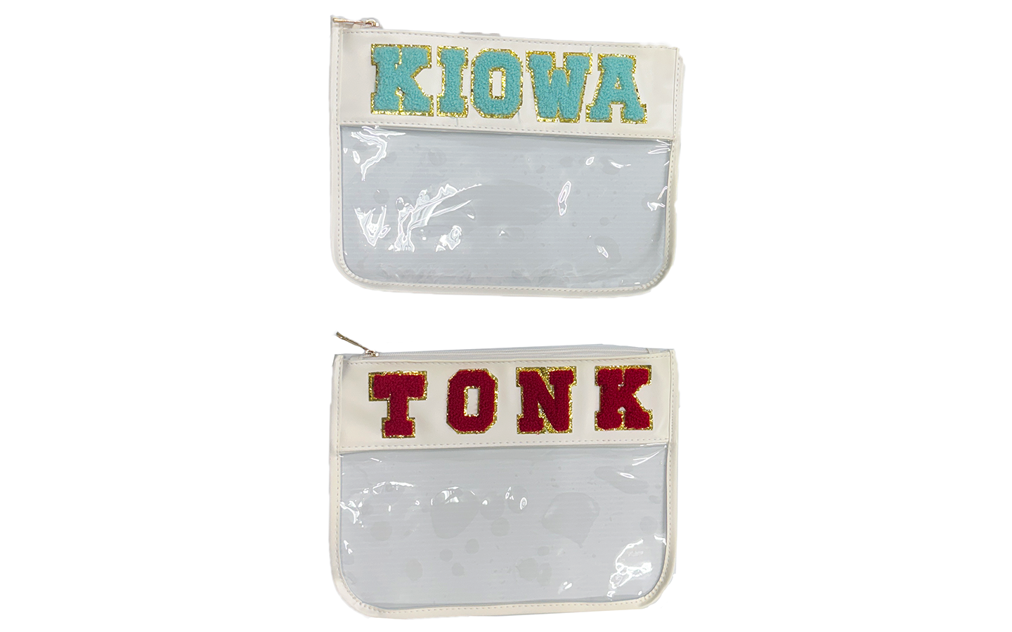 8″ x 12″ PVC pouch w/ chenile letters. Choose Kiowa or Tonk.